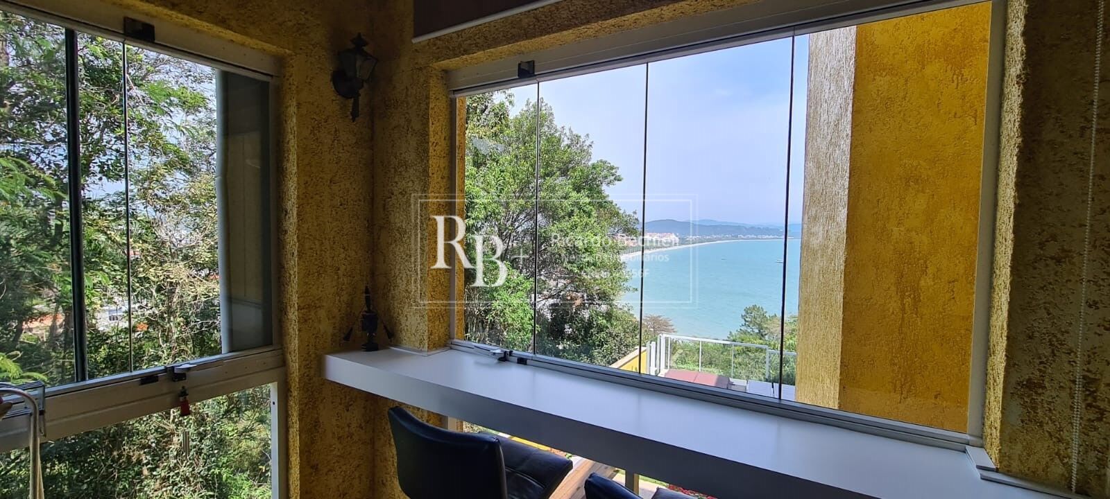 Apartamento com vista para o mar e apara área verde.